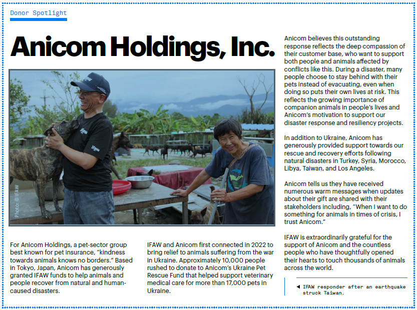 アニコム ホールディングス株式会社(東京都新宿区、代表取締役 小森 伸昭、以下 アニコム)は、CSR活動の一環として、災害時等におけるどうぶつ支援に取り組んでいます。特に海外で発生した災害の際には、主に寄付を募り、IFAW(国際動物福祉基金)への募金活動を行ってまいりました。こうした継続的な取り組みが評価され、このたびIFAWのニュースレター「Insider Update 2nd Edition 2025」において、「Donor Spotlight」のコーナーでご紹介いただきました。