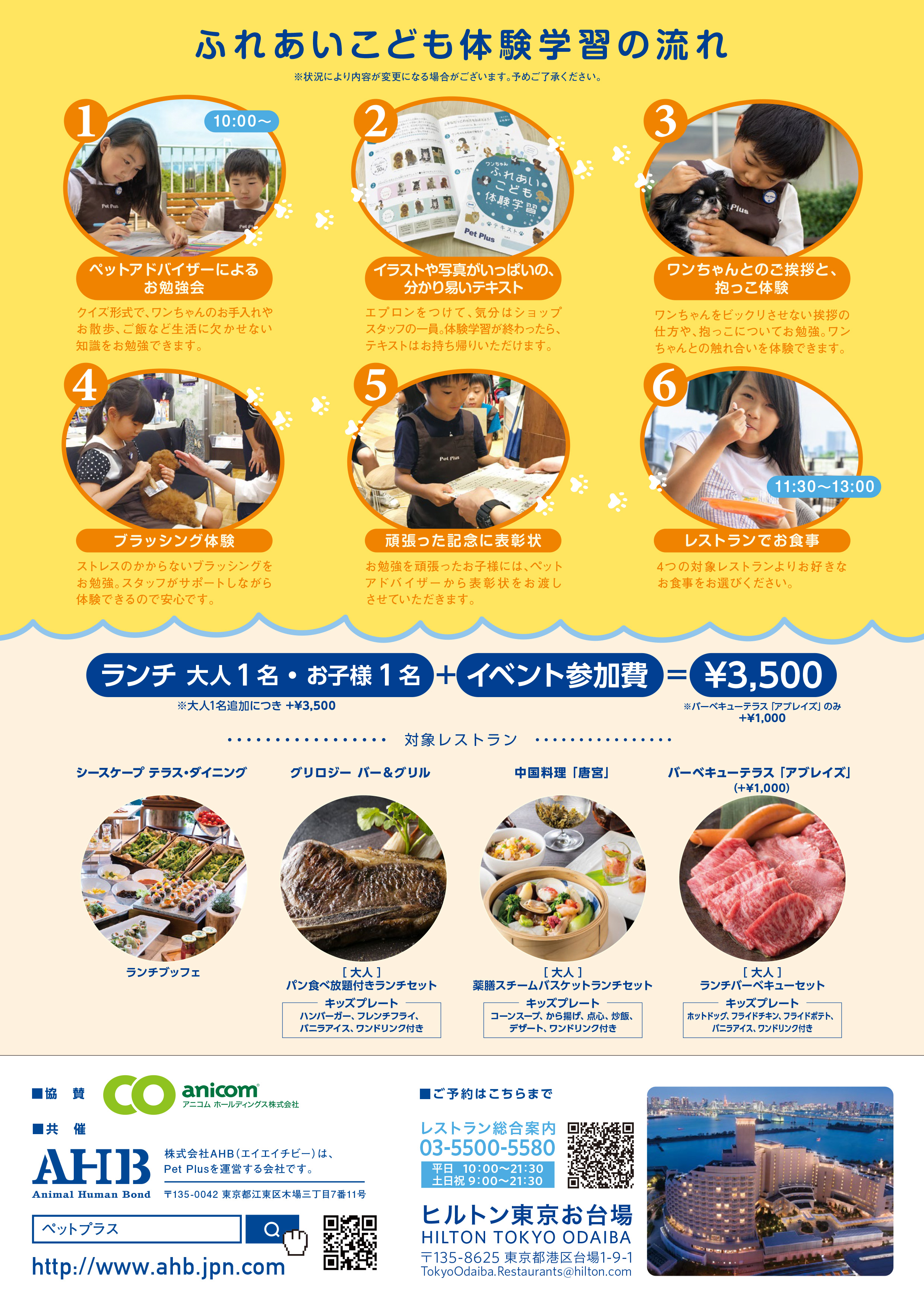 本イベントは、「Pet Plus」が毎年開催する、のべ2000組以上の親子が参加した人気イベントです。ワンちゃんを抱っこしたり写真を撮ったりと、実際にふれあうだけでなく、ペットアドバイザーによる勉強会も行います。さらに今回は、体験後にヒルトン東京お台場の4つのレストランより選べるランチをお楽しみいただけるのも魅力の一つです。お子様とのお出かけの機会が増えるこの季節に、都心から好アクセスでレジャーにも最適なお台場にて、特別な夏休みの体験をお楽しみください。